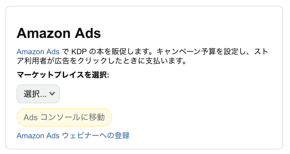 利用しない国の広告アカウントまで発行されるので煩わしい感じはあります。一方でAmazon Adsの登録ページから広告アカウントを発行すると、KDPアカウントと紐付けされていないので、KDPの管理画面側から広告アカウントに遷移することができません。