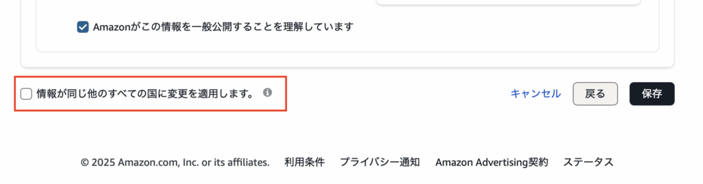 はじめて「請求プロファイル」と「支払いプロファイル」を登録する際に、「情報が同じ他のすべての国に変更を適用します。」のチェックを入れると、入力した情報が「すべての国」に反映されます。最初はチェックを外して、「日本の支払い設定」だけに反映されるようにした方が安全です。