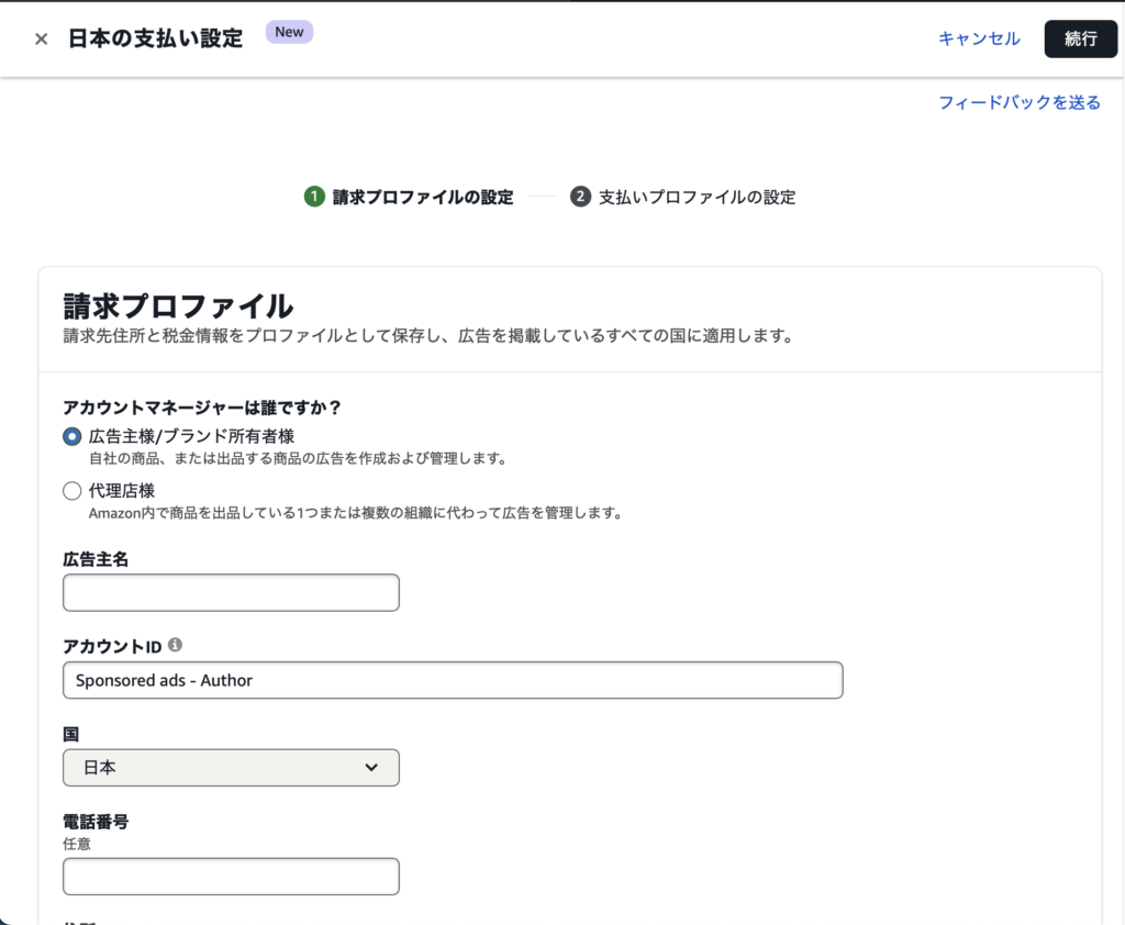 アカウントID(名前)の初期値が「Sponsored ads – Author」になっているので、ご自身の「お名前」か「社名」に変更しておくと識別しやすくなります。